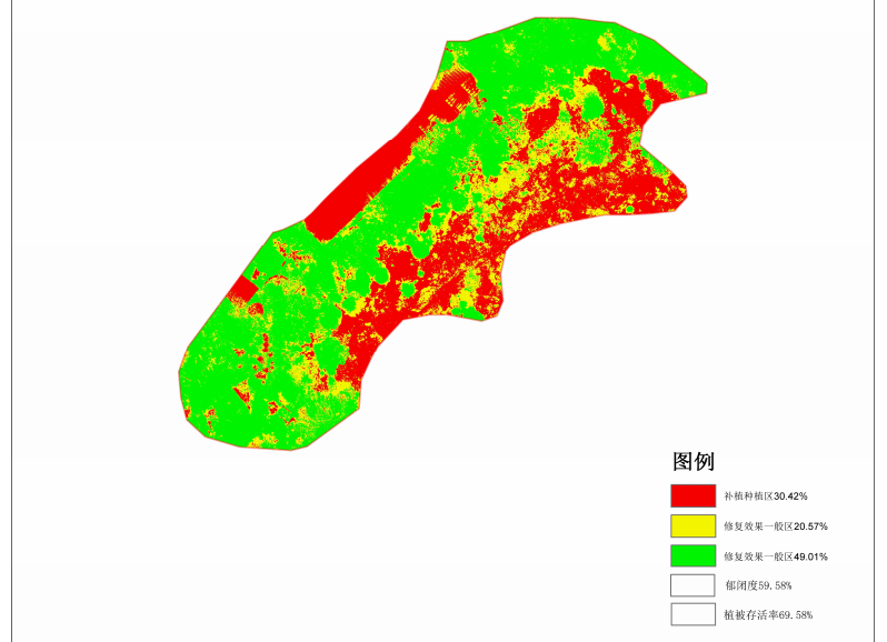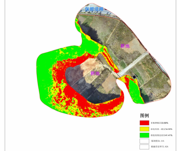 技術(shù)創(chuàng)新:該項目明晰了生態(tài)修復(fù)植被覆蓋圖的成圖原理,啟用了無人機多光譜航拍,通過正射影像與閾值掩膜等方法解算,利用遙感解譯、大疆智圖、GIS技術(shù)對NDVI樣本值區(qū)間進行分類等方法,成功突破了礦山生態(tài)修復(fù)植被覆蓋狀況監(jiān)測的分析機理,為生態(tài)修復(fù)植被覆蓋圖的成圖提供了可靠的保障。